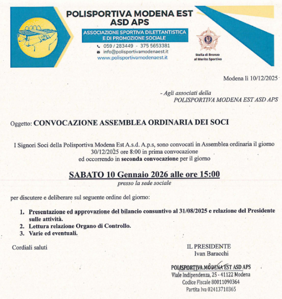 I Signori Soci della Polisportiva Modena Est A.s.d. A.p.s, sono convocati in Assemblea ordinaria il giorno 30/12/2025 ore 8:00 in prima convocazione